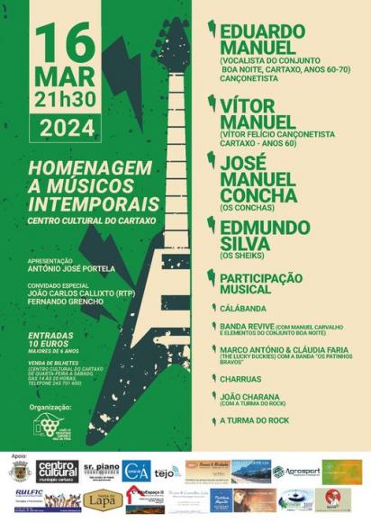 É já no próximo sábado, dia 16 de março, que o Centro Cultural do Cartaxo (CCC) se prepara para receber mais uma 'Homenagem a Músicos Intemporais'. Nesta edição, que terá como anfitrião da noite, António José Portela, e como convidados especiais, João Carlos Callixto (RTP) e Fernando Grencho, são esperadas grandes emoções, aliadas ao melhor da música portuguesa. O espetáculo, que presta homenagem a diversos vultos da música nacional, terá a participação dos seguintes artistas: Cálábanda Banda Revive Marco António & Cláudia Faria Charruas João Charana A Turma do RockA União de Freguesias do Cartaxo e Vale da Pinta convida todos os apaixonados por música a deslocarem-se até ao CCC, já no próximo sábado. O evento está marcado para as 21h30.Como adquirir o seu bilhete?Poderá encontrar o seu ingresso à venda no Centro Cultural do Cartaxo, de quarta-feira a sábado, das 14 às 20 horas.Não há desculpas para não fazer parte de mais uma belíssima noite de música na cidade do Cartaxo. Marque já na sua agenda. Estamos a contar consigo!