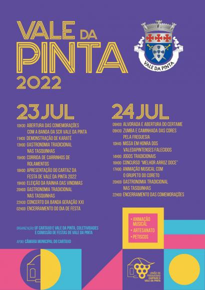 No fim-de-semana de 23 e 24 de Julho visite Vale da Pinta e assista às comemorações do dia de Freguesia de Vale da Pinta onde haverá Espectáculos Musicais, Demonstração de Karaté, Eleição da Rainha das Vindimas , Artesanato, Refeições, Petiscos, Jogos Tradicionais, Doces e Bebidas.Programa: 23 Julho10h30- Abertura das Comemorações com a Banda da SCR Vale da Pinta11h00- Demonstração de Karaté13h00- Gastronomia Tradicional nas Tasquinhas15h00- Corrida de Carrinhos de Rolamentos ( Inscrições Abertas :presencialmente na Delegação de Vale da Pinta no horário normal de funcionamento, por email: geral@jf-cartaxoevaledapinta.pt ou por telefone: 243 719 160 com indicação do nome, contacto telefónico e email dos participantes)18h00- Apresentação do Cartaz da Festa de Vale da Pinta 202219h00- Eleição da Rainha das Vindimas20h00- Gastronomia Tradicional nas Tasquinhas22h30- Concerto da Banda Geração XXI02h00- Encerramento do Dia de Festa24 Julho09h00- Alvorada e Abertura do Certame09h30- Zumba e Caminhada das Cores pela Freguesia10h45- Missa em Honra dos ValedaPinteses Falecidos14h00- Jogos Tradicionais16h00- Concurso "Melhor Arroz Doce"(Inscrições Abertas :presencialmente na Delegação de Vale da Pinta no horário normal de funcionamento, por email: geral@jf-cartaxoevaledapinta.pt ou por telefone: 243 719 160 com indicação do nome, contacto telefónico e email dos participantes)17h00- Animação Musical com o Grupeto do Coreto20h00- Gastronomia Tradicional nas Tasquinhas22h00- Encerramento das Comemorações